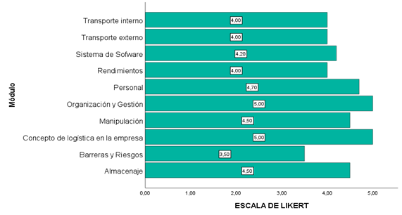 Esto pone de manifiesto que: la empresa posee buena estructura bien caracterizada como parte de sus niveles y subordinada a la alta dirección; visión estratégica consolidada con flujos de productos que inciden en una adecuada gestión de inventarios; eficiencia operativa que integra eficientemente las actividades y procesos logísticos. Sin embargo, el módulo de barreras y riesgos registró el más bajo puntaje con una evaluación de 3.5. De este resultado se deriva que existen deficiencias en cuanto al conocimiento y manejo por parte del personal de las barreras y riesgos tanto del entorno como internos. Asimismo, se aprecia la ausencia de estrategias que permitan superar dichas barreras y mitigar los riegos identificados.