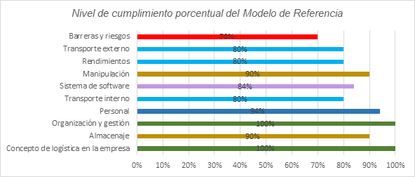 En este análisis, destacan con puntuación de excelente (≥90%), los módulos: Organización y gestión y Concepto de logística con el 100%, lo que refleja un alto grado de desarrollo estratégico en la gestión logística. Le siguen, Personal con un 94% seguido de Manipulación y Almacenaje con un 90% cada uno, lo que evidencia una ejecución operativa eficaz. Como buenos (89–80 %), se califican las funciones asociadas a Sistema de software, con un 84% y, las de Transporte interno, Transporte externo y Rendimientos, con un 80% cada uno. El módulo Barreras y riesgos presenta el porcentaje más bajo de cumplimiento, con un 70%, considerado como regular (79–60%).