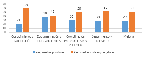 El 52.5% evalúa negativamente los elementos asociados a la documentación y claridad de roles. Solo un 30% considera que los procesos están documentados y actualizados, un 65% tiene claridad sobre su rol pero existe un 35% con dudas o desconocimientos.