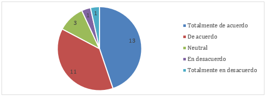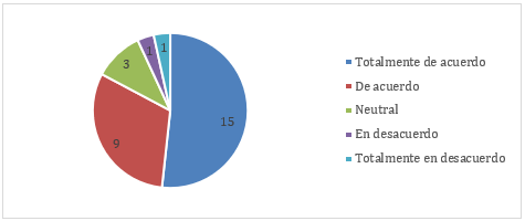 Con relación a la experiencia positiva que ha tenido la docente al enseñar a estudiantes, el 41,38% de los docentes estuvo totalmente de acuerdo, el 34,48% estuvo de acuerdo. Solo el 24,14% se manifestó de manera neutral o en desacuerdo. Esto muestra que al aplicar métodos de enseñanza se pueden tener experiencias positivas con los estudiantes.
