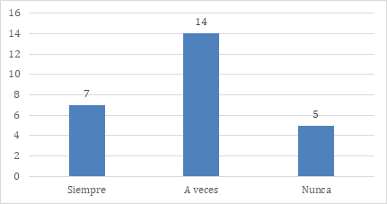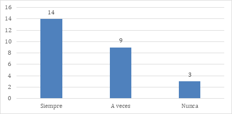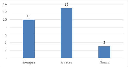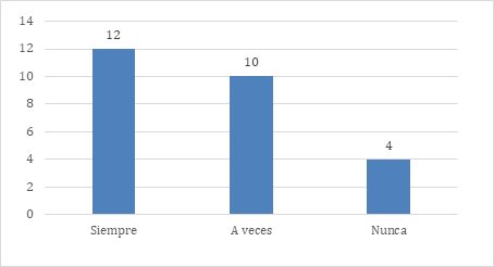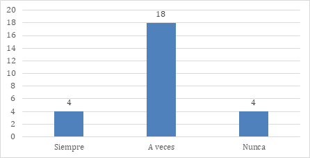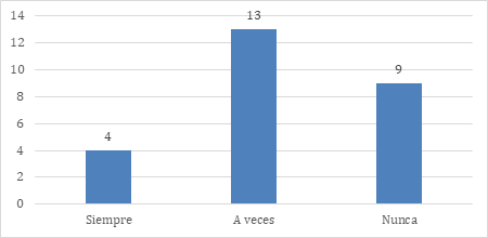 El 26.92 % de los encuestados aplica de manera constante el trabajo colaborativo, siguiendo la teoría sociocultural de Vygotsky, que resalta la interacción social como medio para el aprendizaje. El 53.85 % restante no lo implementa con la misma frecuencia, lo que limita los beneficios de esta metodología, y el 19.23 % nunca la aplica. Este hallazgo evidencia la necesidad de reforzar la formación en estrategias colaborativas para maximizar su impacto en el desarrollo de competencias cognitivas y sociales.