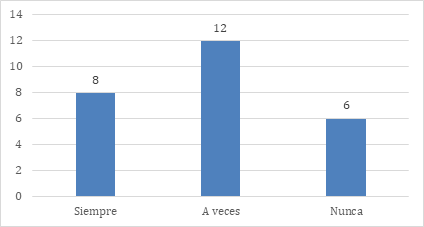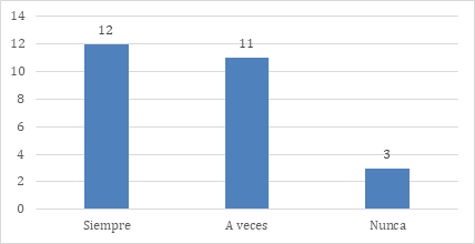 Al consultar sobre la planificación de actividades específicas para el desarrollo del razonamiento lógico en las clases de matemáticas, como se observa en la figura 1, el 46.15% de los docentes planifica actividades específicas para desarrollar el pensamiento lógico-matemático en sus clases, mientras que el 38.46% lo realiza a veces y el 15.39 % nunca. Este resultado indica 84.61 % de los docentes se preocupa por el desarrollo del pensamiento lógico.