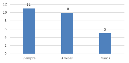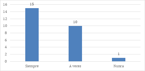 El 53.85 % de los encuestados relaciona los nuevos contenidos con los conocimientos previos de los estudiantes, mientras el 34.62 % lo hace a veces y el 11.54 % nunca. Esta práctica favorece el aprendizaje significativo, al permitir que los estudiantes construyan nuevos conocimientos sobre una base existente. Este resultado se configura como una fortaleza dentro del proceso educativo.