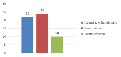 Por último, en la figura 11 se muestra el conocimiento sobre las distintas teorías del aprendizaje. El aprendizaje significativo y el conectivismo son ampliamente conocidos con un 84.62 % y un 92.31 % respectivamente mientras el conocimiento del constructivismo solo obtiene un 38.46 %.