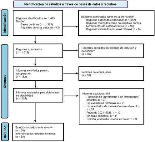 Para esto, se definieron los criterios de elegibilidad, que consistieron en estudios con estudiantes de instituciones públicas en modalidades presencial, virtual o híbrida; se incorporaron trabajos sobre evaluación formativa vinculada con motivación y rendimiento académico. Se incluyeron estudios de diseño mixto, revisiones de literatura, herramientas como rúbricas, coevaluación y retroalimentación; textos en español, inglés y portugués publicados entre 2021 y 2025, acceso abierto, completos.