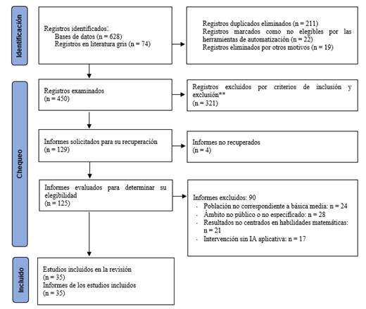 Se omitieron textos repetidos, incompletos o no legibles, donde no se apreció la presencia de uso de IA; también se excluyeron estudios con pequeños grupos; igual, se descartaron investigaciones de institutos privados o de nivel educativo diferente al subnivel medio de educación básica; por último, se dejaron de lado documentos no pertinentes con matemáticas, resúmenes o textos sin número y que no eran de las fechas proporcionadas.