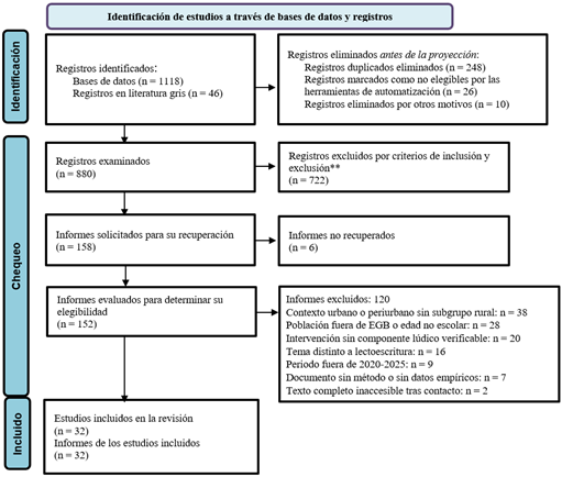 Para obtener la información, se utilizó una matriz en Microsoft Excel centrada a los 32 estudios incluidos, registrando el nombre de los autores, año, país, tema, diseño y metodología, población y muestra, los resultados obtenidos, limitaciones, nivel y calidad de las evidencias, categorías y formas de acceso a la información. Posteriormente, la información se organizó de acuerdo con la base consultada, tanto el año, el país y el tipo de estudio y se examinó mediante un componente bibliométrico enfocado a la productividad, colaboración y citación. Asimismo, se proyectó una síntesis narrativa integrando los efectos sobre conciencia fonológica, decodificación, fluidez, ortografía y producción escrita, diferenciando los subgrupos de acuerdo con la modalidad lúdica y las condiciones rurales unidocentes.