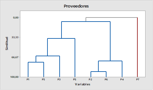 La delimitación de los proveedores potenciales se realizó mediante un Análisis de Clúster, con el objetivo de seleccionar los proveedores de similitud superior al calificado como “suficiente”. El software utilizado en este caso fue el Minitab Statistical Software, Versión 21.1.0. En la Figura 2 se muestra el dendograma resultante. Los proveedores seleccionados en este paso intermedio fueron Emprestur Villa Clara (P1), Cimex Cienfuegos (P3) y Tecnotur Villa Clara (P5), por formar parte del mismo clúster que el proveedor “suficiente”.