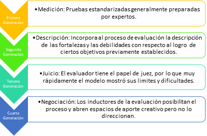 Según Lincoln (2012) en su libro paradigmas en la competencia de la investigación científica, define que “la evaluación, ha tenido una larga historia en donde se ha producido un conjunto de factores interactuantes por procesos de construcción y reconstrucción de su concepción y planeamiento”. (p. 122) En esta definición se identifican cuatro generaciones de evaluadores quienes con su entendimiento y acción han creado tendencias y posiciones determinadas y claramente definidas. Estas generaciones se pueden identificar mejor con los términos de: medición, descripción, juicio y negociación.