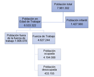 A 2023, La Tasa Global de Participación TGP en Bogotá del 70.8% refleja una fuerte presión de la Población en Edad de Trabajar PET sobre el mercado laboral, la Tasa de Ocupación TO se registra en un 64.2% que presenta la relación entre la población ocupada y las personas que se encuentran en edad de trabajar. El desempleo o Tasa de Desocupación TD se ubica en el 9.4%, que equivale a la porción de la Población de la Fuerza de Trabajo que están buscando trabajo.