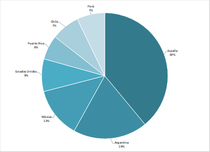 Los principales clientes ubicados en el exterior a quienes los 22 Call Center prestan servicios de exportación son España en primer lugar con un 39% de la participación del mercado, en segundo lugar, Argentina 19% y México 13%.