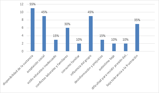 En la figura 2 se exponen los factores de riesgo de alcoholismo que más se evidencian en la muestra estudiada son la disponibilidad de la sustancia para un 55%, la aceptación social con un 45%, los conflictos laborales y familiares para un 30%, la influencia del grupo con un 45% y la baja tolerancia a la frustración mostrándose en un 35%. En el fenómeno en si se muestran factores de riesgo macrosociales, microsociales y personales. Lo que nos lleva a comprender que los caminos para llegar a padecer una toxicomanía no se analizan desde una concepción unilateral, sino que en el fenómeno influyen varios aspectos a la vez, aunque la vía sociocultural y la vía evasiva son las que mayor influencia presentan en el campo objeto de estudio.