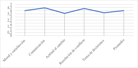 Según los resultados del cuestionario se pudo observar puntajes moderados en cada dimensión. Al mencionar el trabajo en equipo y orientación a los resultados especialmente en el nivel de apoyo y operativo, repercute el puntaje de estos parámetros, puesto que se obtuvo un promedio moderado, lo cual influye directamente con el compromiso de sus actividades laborales, además en el nivel operativo se deben tomar estrategias con respecto a las relaciones interpersonales, como por ejemplo, mantener una comunicación constante con los trabajadores, realizar reuniones, salas de descanso con la finalidad de mejorar este parámetro.
