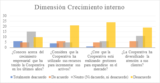 En relación con la dimensión de crecimiento empresarial interno se identificó que en su mayoría se encuentra en desacuerdo con los procesos internos que se establece en la cooperativa. Se identificó que la empresa no ha utilizado recursos para incrementar sus activos, por lo que incide directamente en el crecimiento empresarial; asimismo no se ha realizado gestiones para expandirse en el mercado; además no han contado con una de diversificación en la atención al cliente.