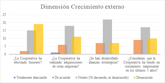 En referencia con la dimensión de crecimiento empresarial externo la mayoría de las preguntas se encuentran en un estado neutro, entre las cuales se identifica que la Cooperativa no realizado fusiones con otras empresas, así mismo la administración desconoce el desarrollo de alianza estratégica.
